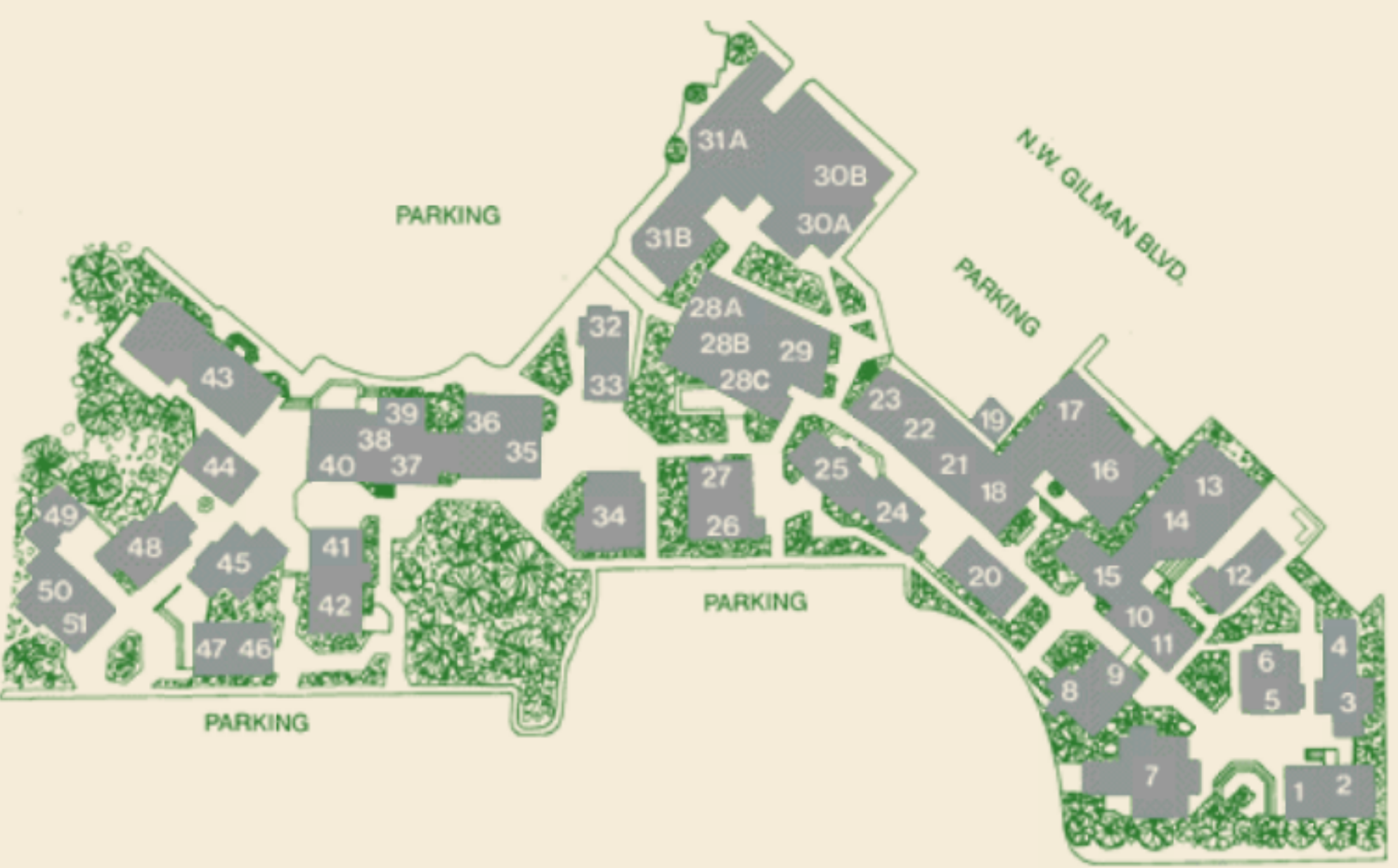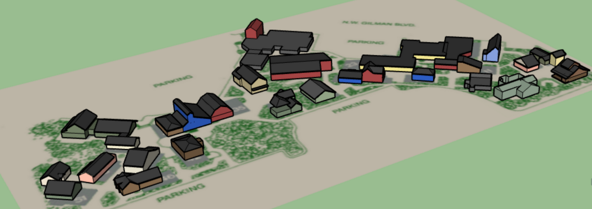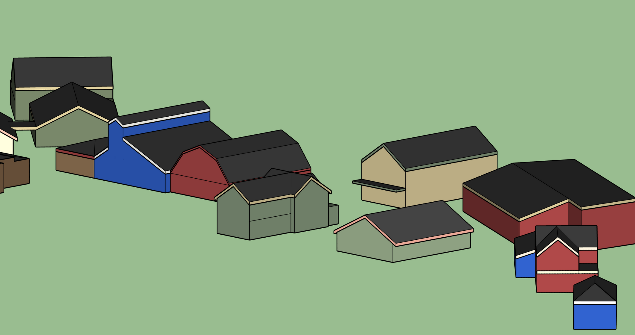 Digital massing modelsUsing SketchUp, I built digital models of the buildings, representing the rough size, shape, color, and roof slope of each. The floor plan helped me organize them with the correct scale and relative location.