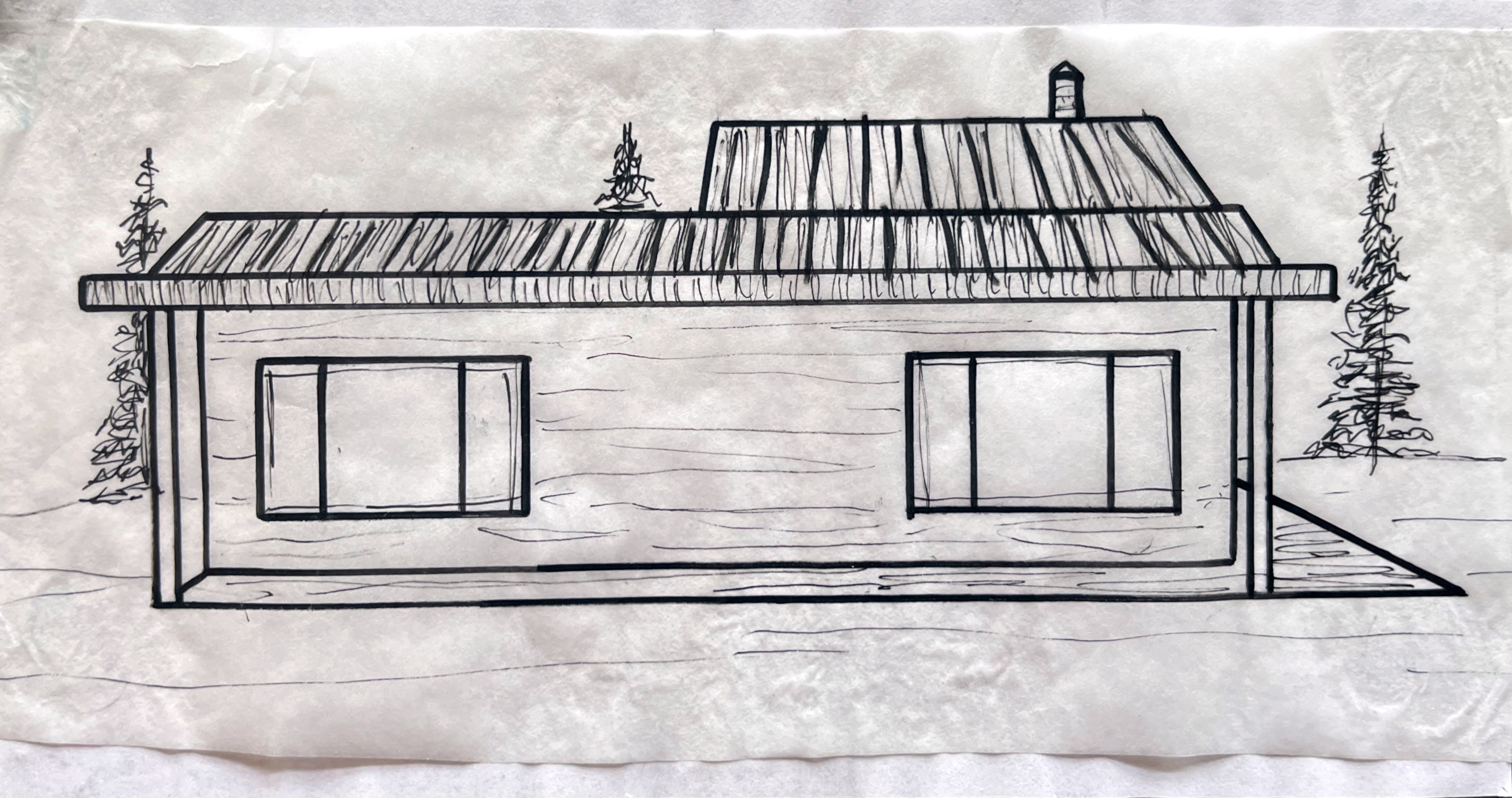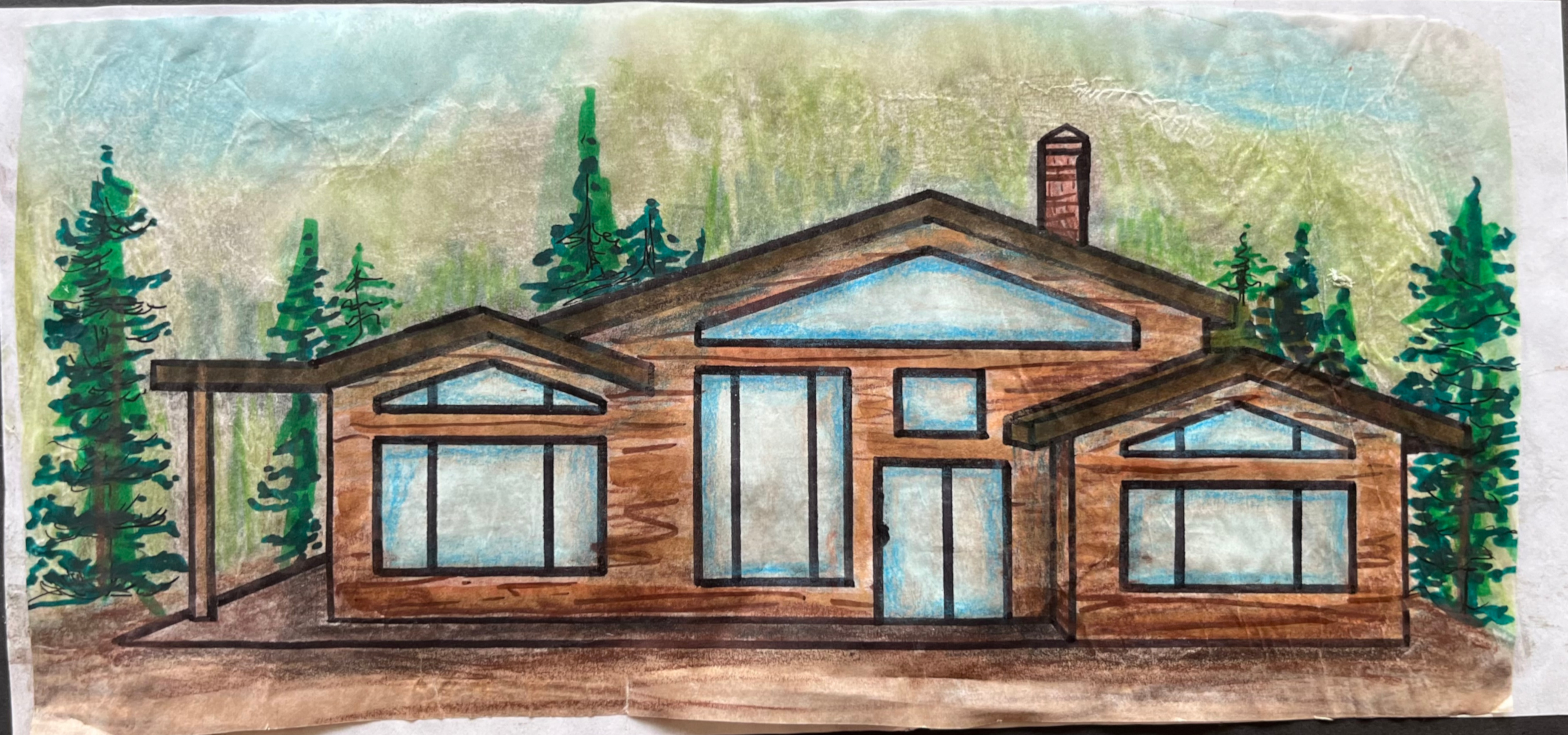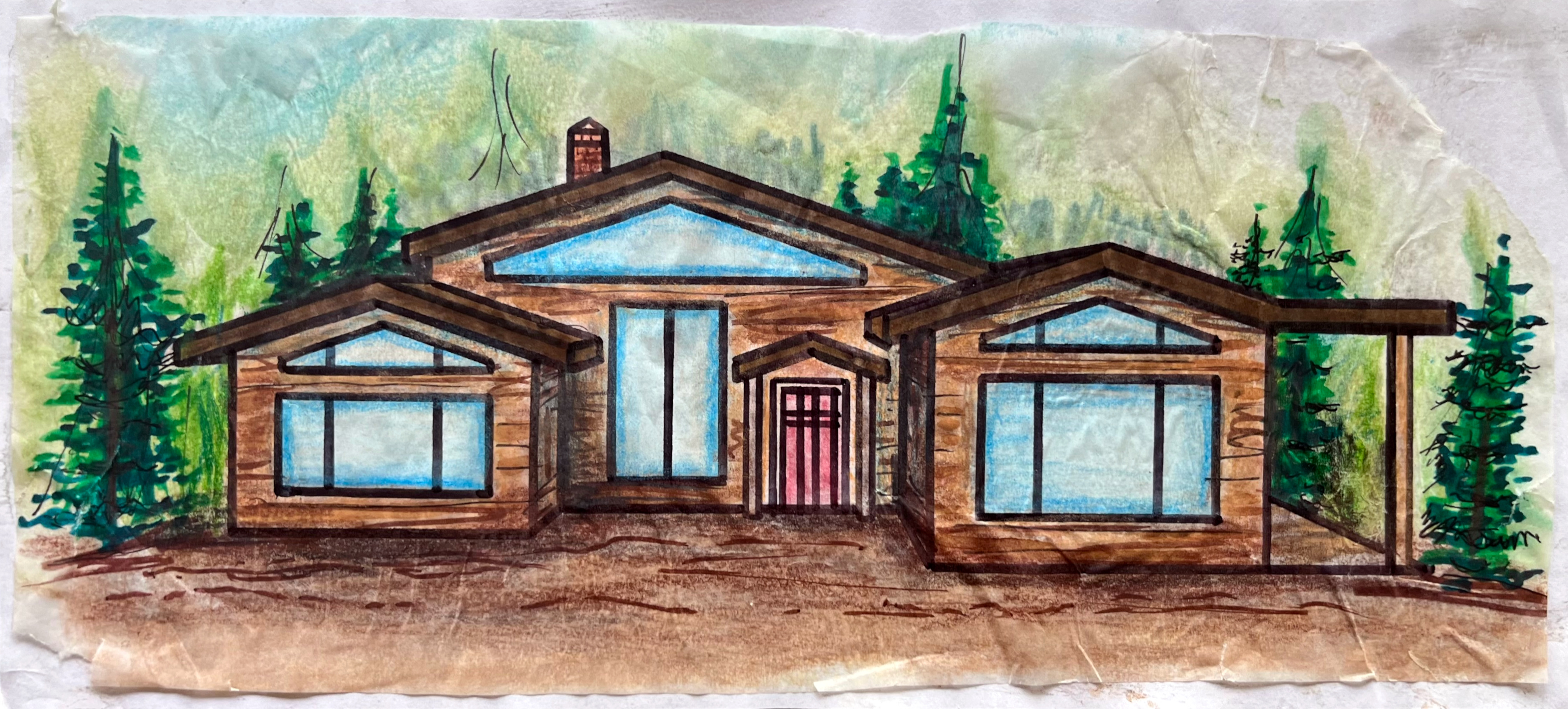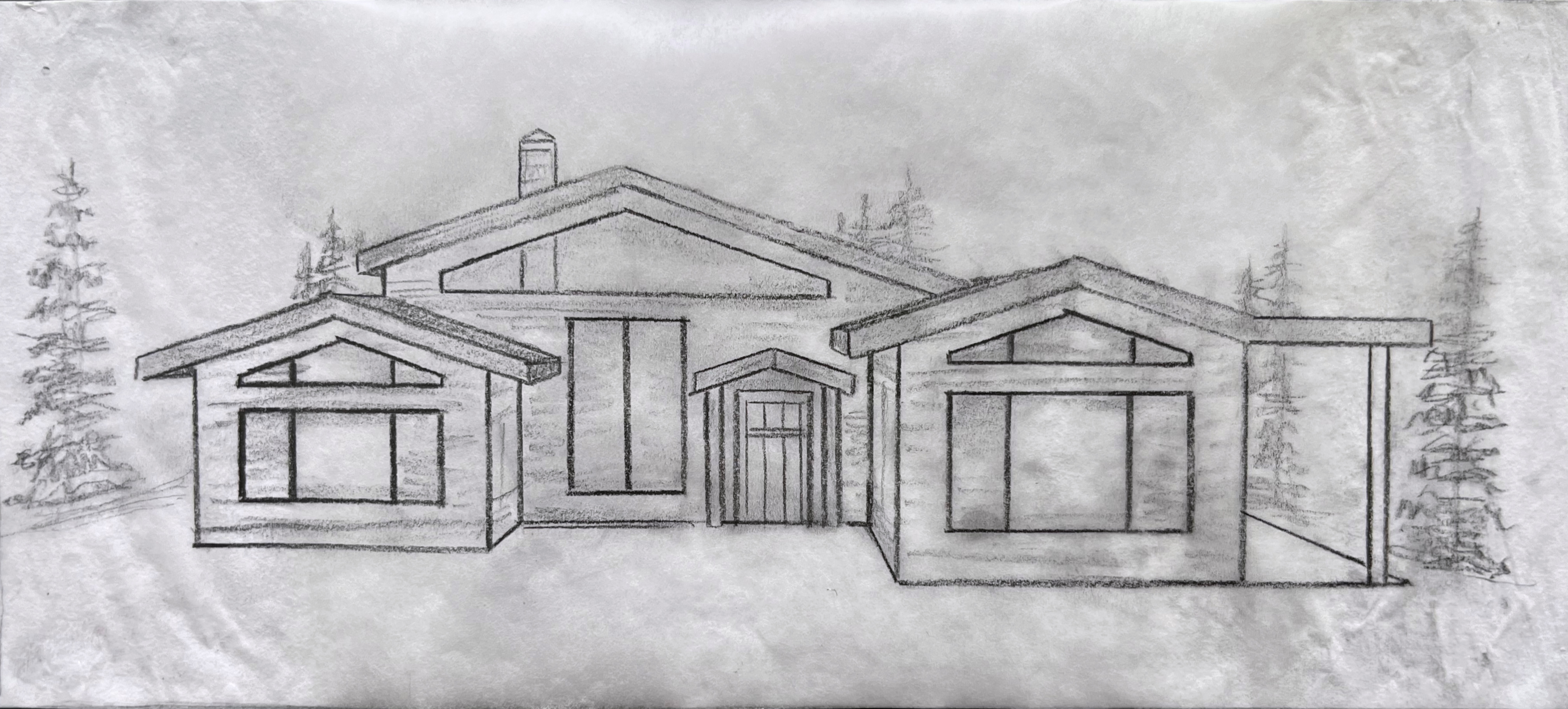 I printed views of elevations from my SketchUp model and traced it in different media. These are final elevations in three different media: pencil, pen, and colored pencil. I love how cozy my color elevations feel, bringing the cabin to life.
