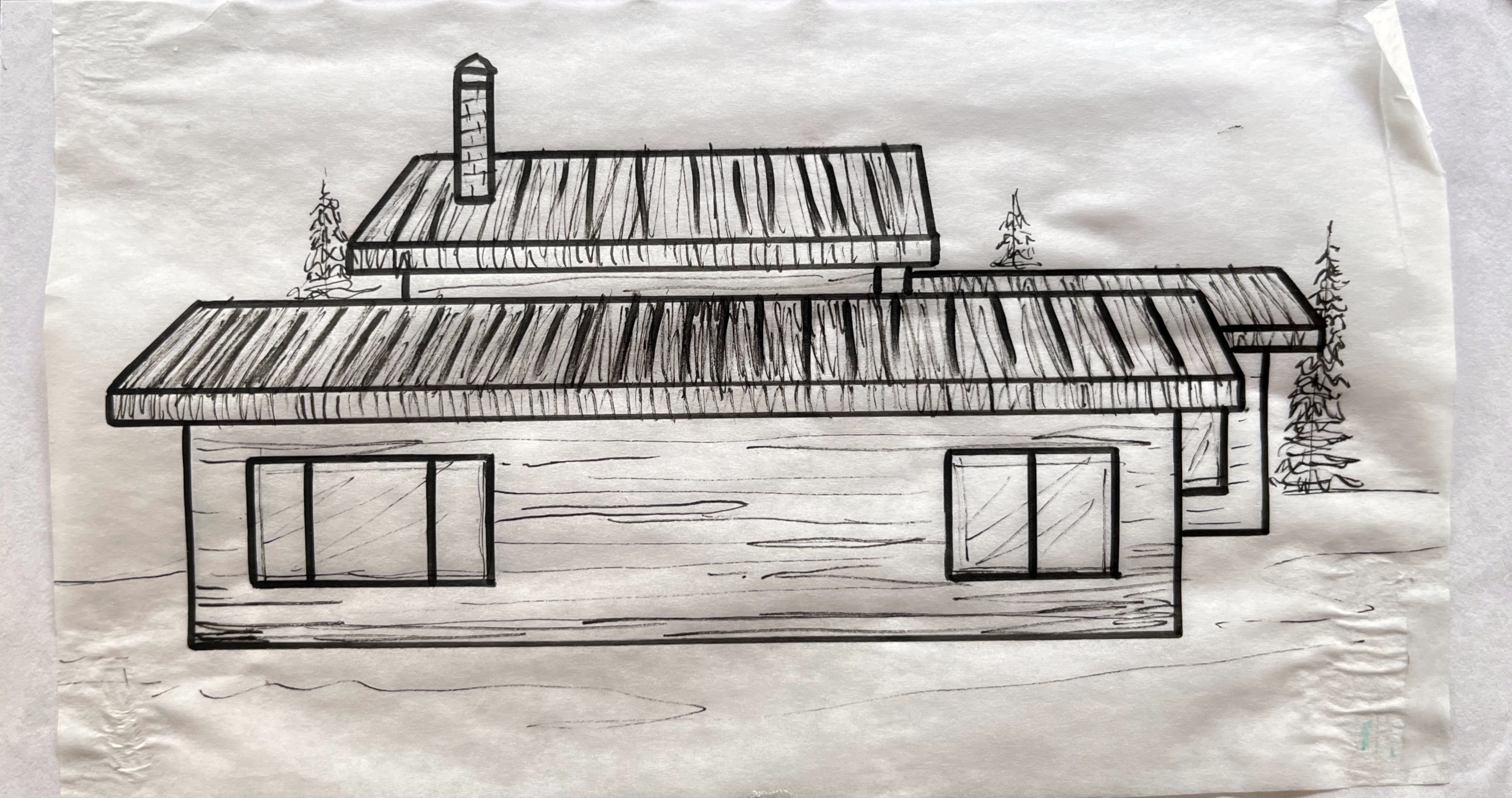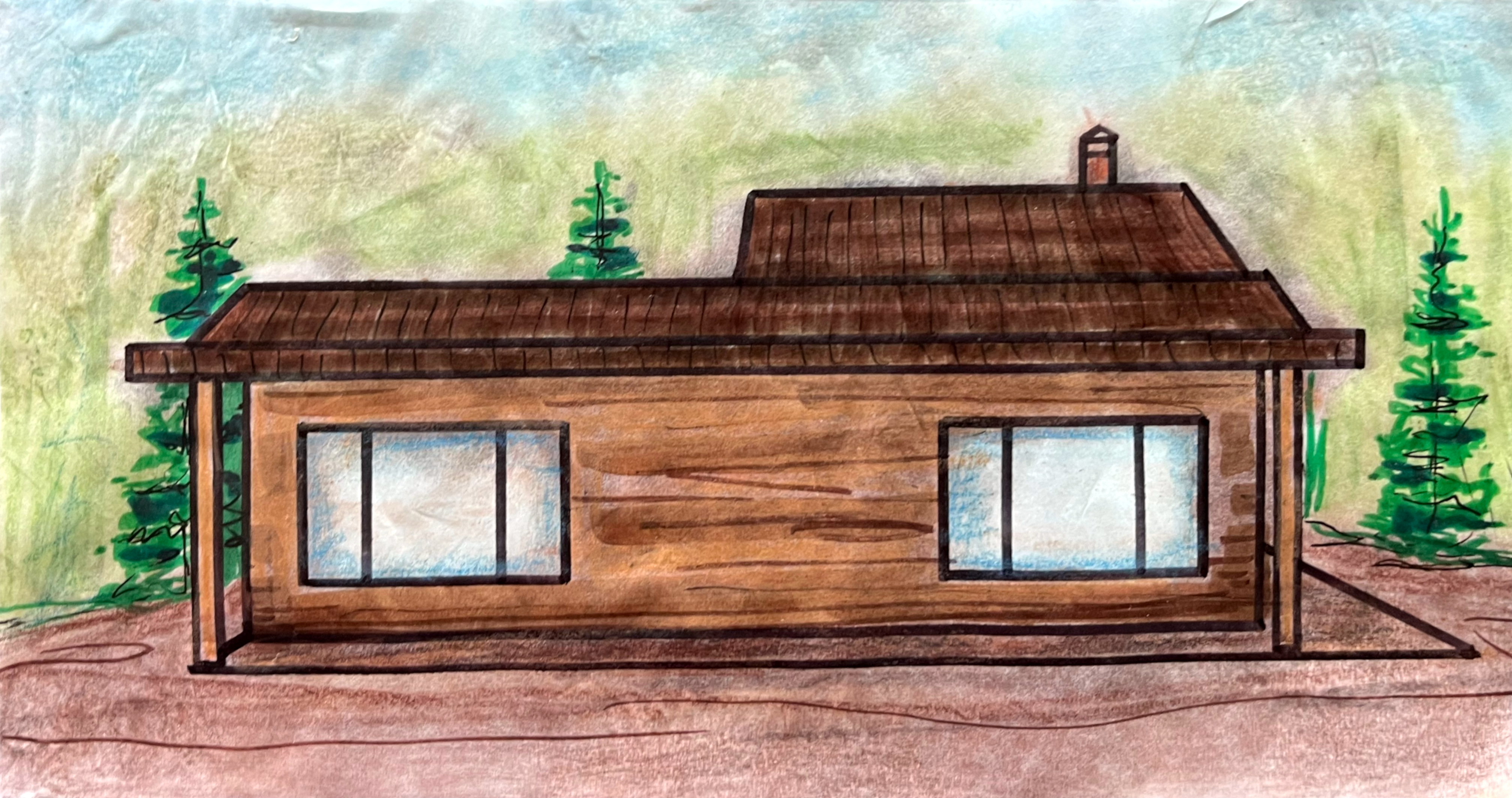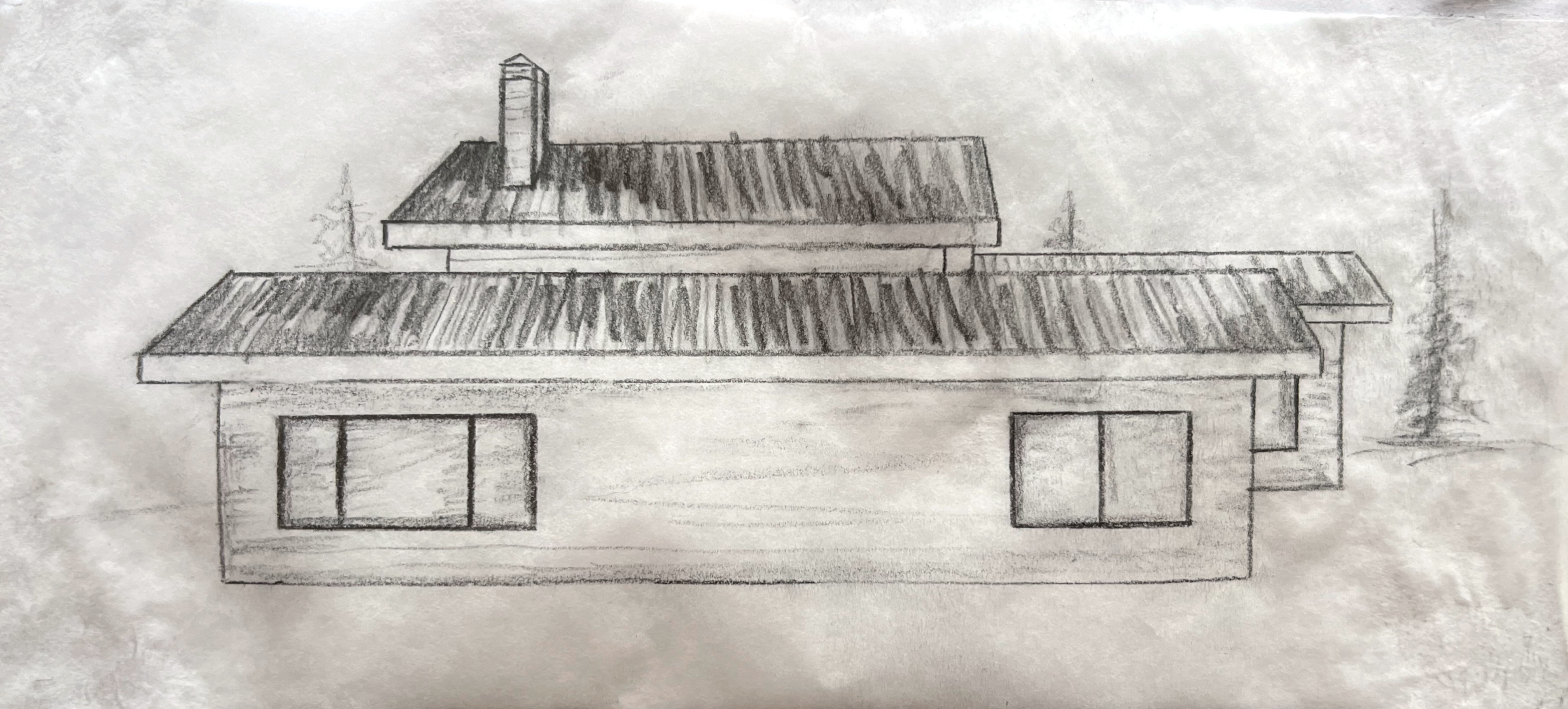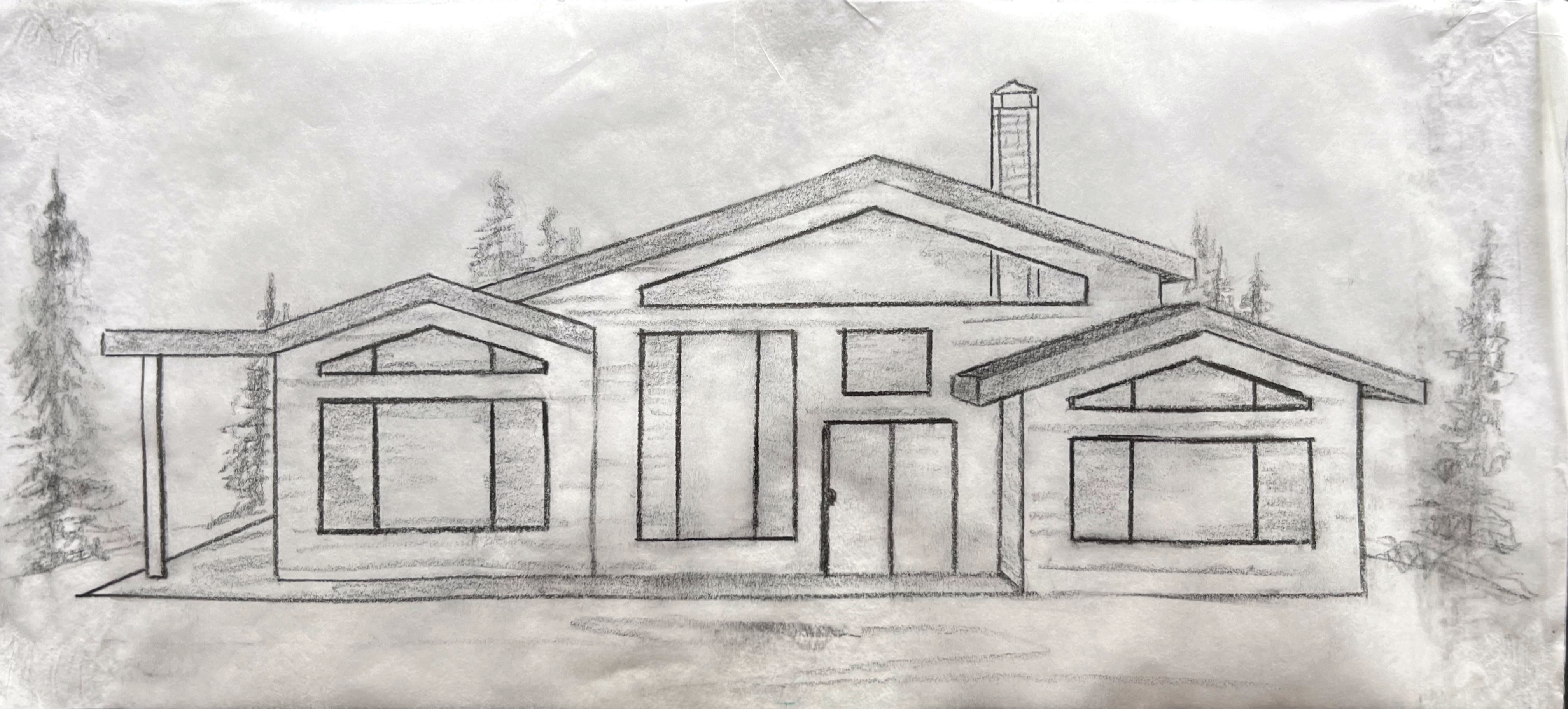 I printed views of elevations from my SketchUp model and traced it in different media. These are final elevations in three different media: pencil, pen, and colored pencil. I love how cozy my color elevations feel, bringing the cabin to life.