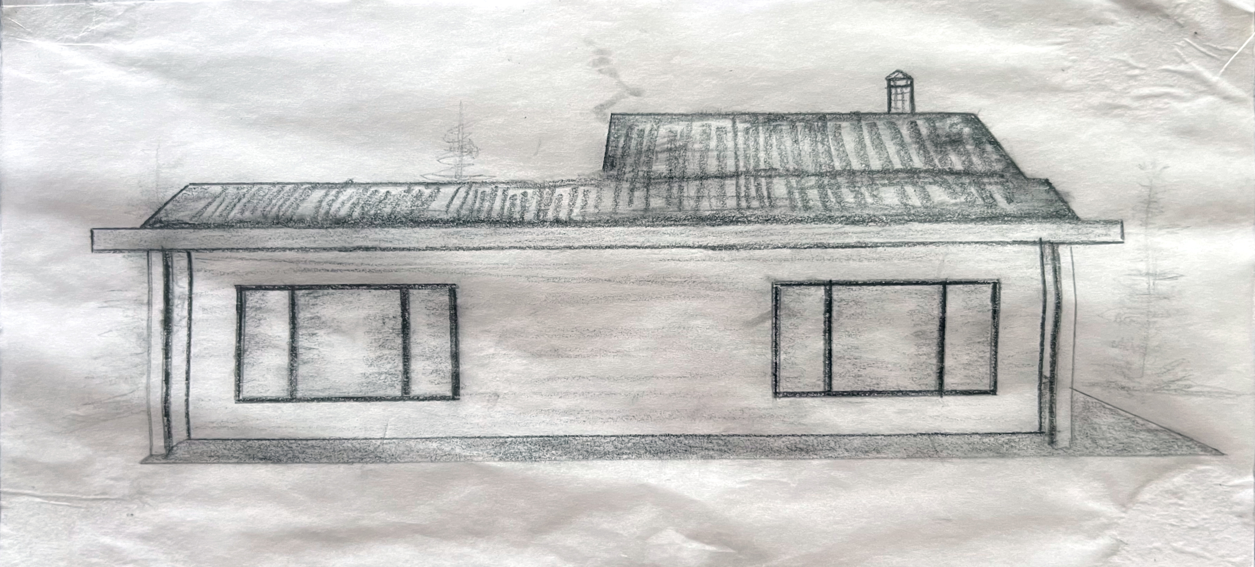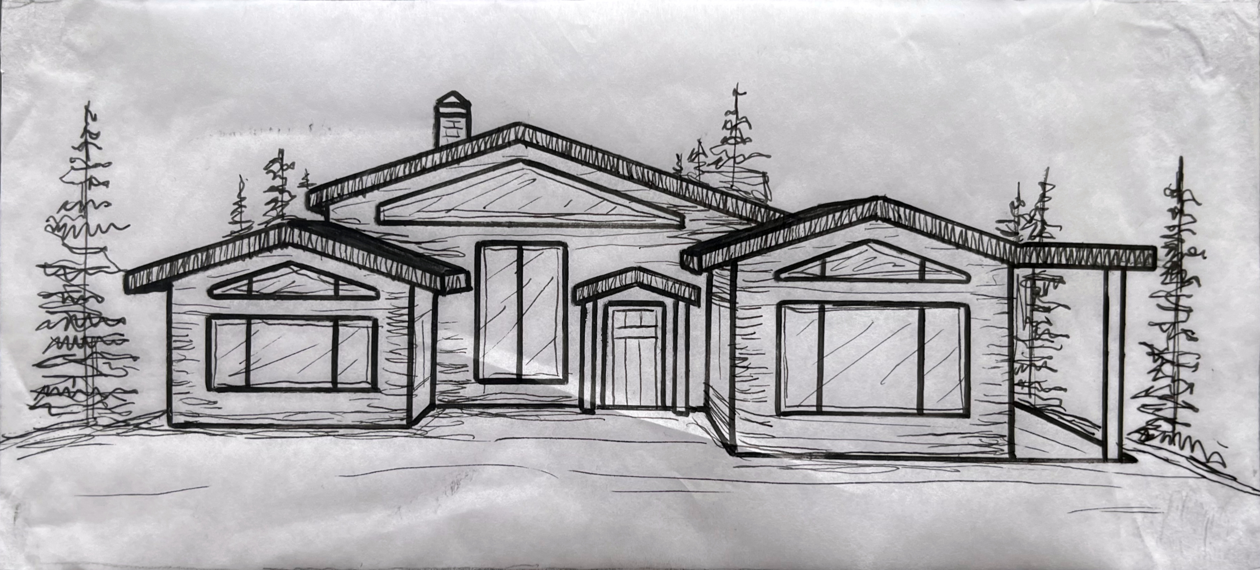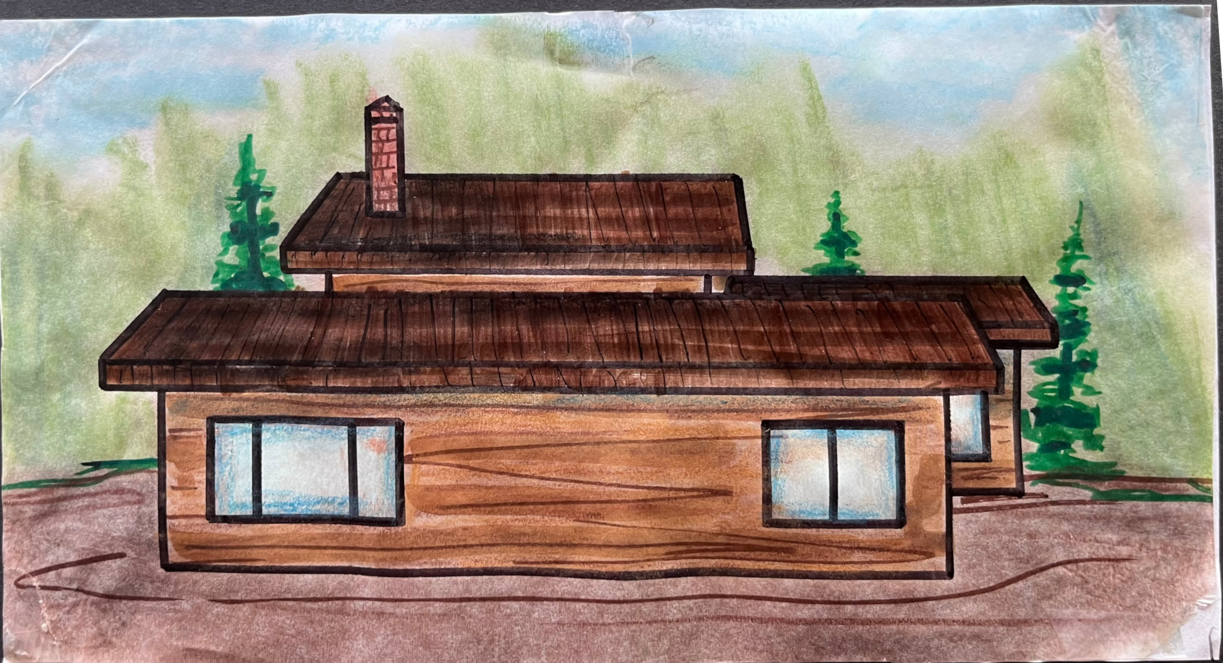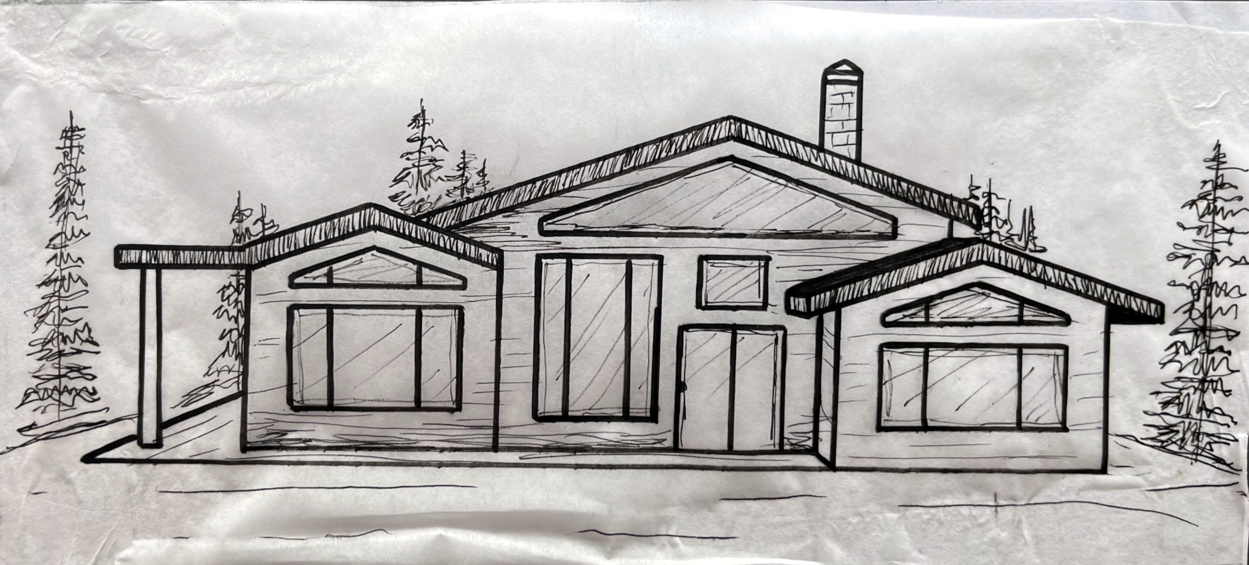 I printed views of elevations from my SketchUp model and traced it in different media. These are final elevations in three different media: pencil, pen, and colored pencil. I love how cozy my color elevations feel, bringing the cabin to life.