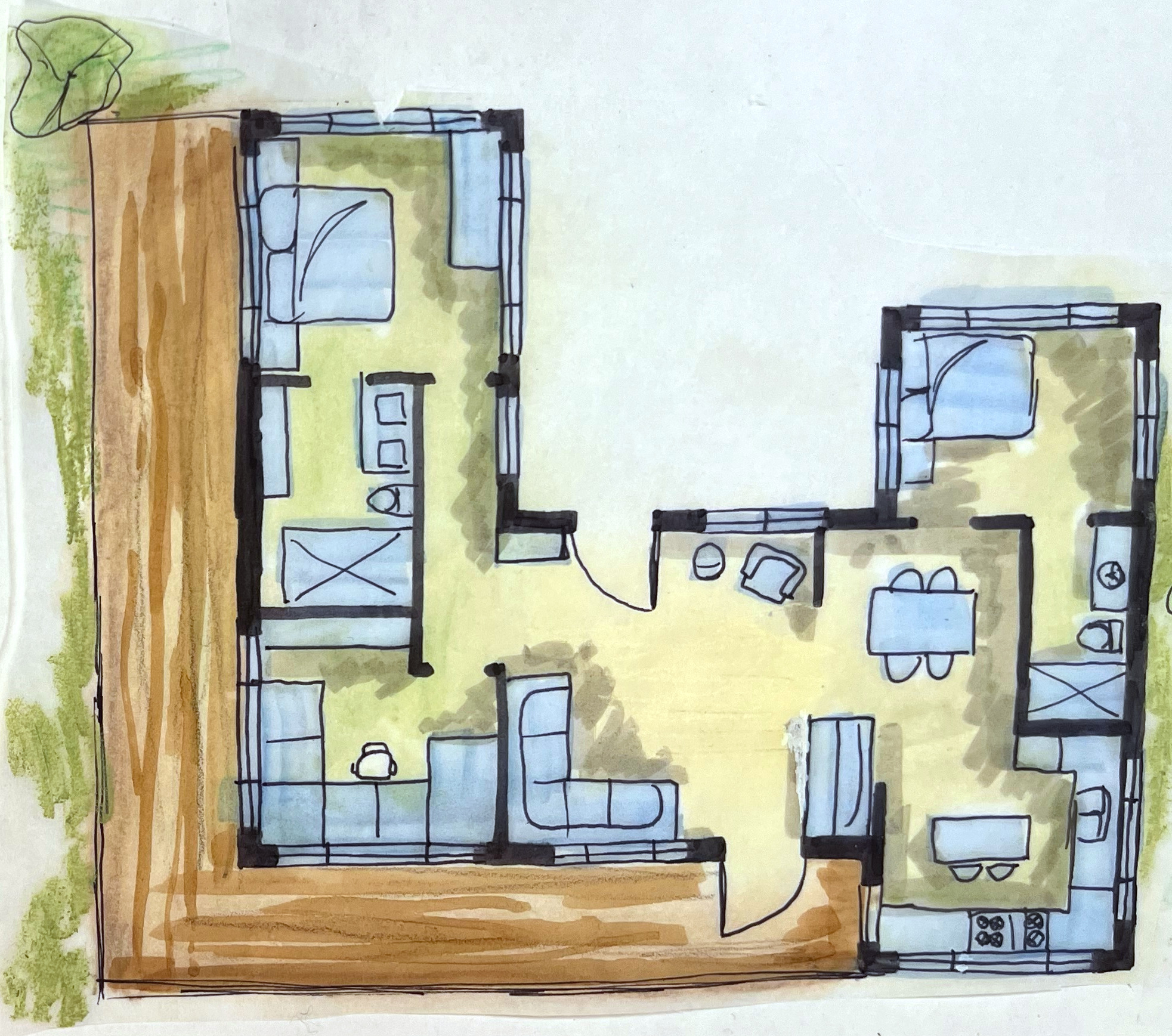 At the beginning of this project, I designed different floor plans and settled on one which combined all my ideas. It’s a small, one floor cabin with a couple bedroom and bathrooms and large, central living and dining rooms. To complete the look, I filled out the sketch with furniture.